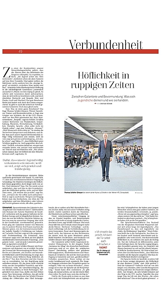 Nun: Was ist denn gutes Benehmen? Das fragt Thomas Schäfer-Elmayer, Wiener Tanzlehrer, Trainer und Benimmkoryphäe, er fragt eine Gruppe von Schülern, die in der HTL Donaustadt vor ihm Platz genommen hat. Kurs: Businessetikette. „Respekt“, sagt ein Schüler. Es fallen weitere Stichwörter wie Pünktlichkeit, Körperhaltung, Manieren, Wertschätzung, Verlässlichkeit, Disziplin, Sprache. „Man sollte nicht im Dialekt reden“, sagt eine Schülerin. „Warum?“ „Weil Wienerisch nicht schön ist.“ So werden die Stichwörter kategorisiert und diskutiert, und dafür, dass auch unsere Jugend der Kontinuität zufolge völlig verkommen sein müsste, weiß sie viel, zeigt sich gewitzt und lernbegierig. „Ich denke schon“, sagt Niklas, 17, „dass Höflichkeit unter Schülern gegeben ist. Auch gegenüber den Lehrern.“ Freilich, es komme darauf an, wie gut man einander kenne, wie vertraut man miteinander sei. Und ob man mit Mädchen rede. „Wir achten schon darauf, dass wir höflich mit den Mitschülerinnen sind“, sagt Justin, 16.